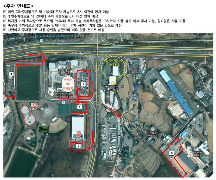 주차는 체육관 지하 및 뒤쪽, 복지회관 야외(9시까지는 불허, 9시부터 가능 13시 이후는 복지관 지하도 가능, 일요일은 7시부터 야외 지하 모두 가능), 주차 시설이 열악하여 천안여고 주차장 사용 승인