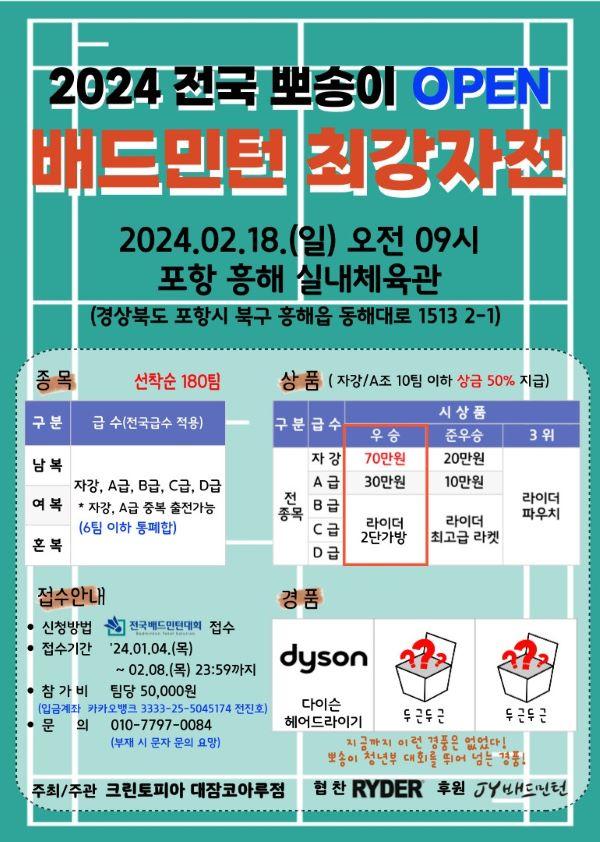 '2024 전국 뽀송이 OPEN 배드민턴 최강자전' 개요 및 요강입니다.
