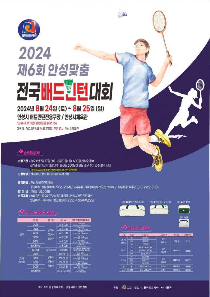 | 대회장소 | 안성시 종합운동장내 1.배드민턴전용구장2.실내체육관 (안성시 보개면 종합운동장 162) |