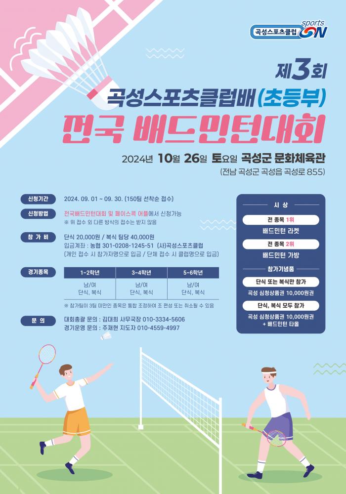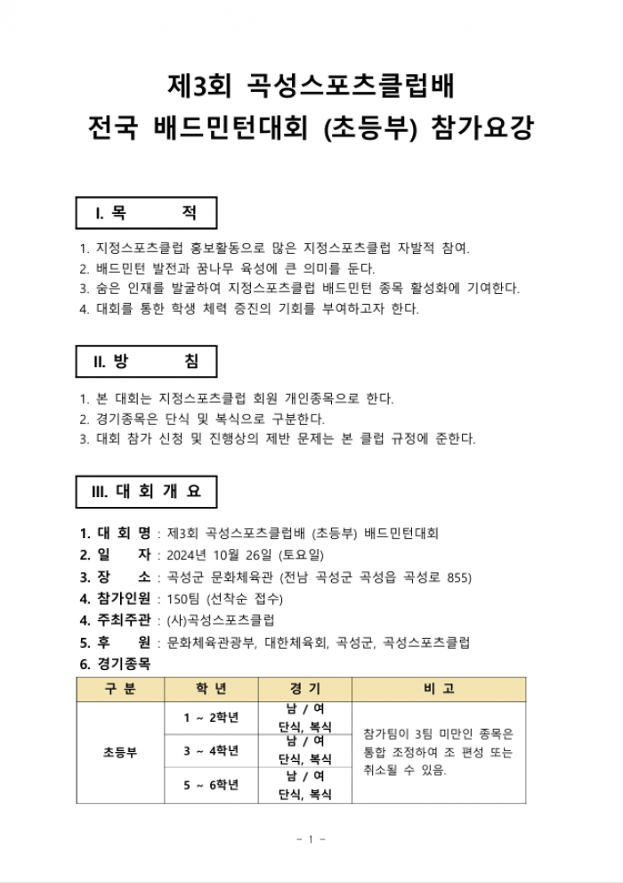 1. 대 회 명 : 제3회 곡성스포츠클럽배 (초등부) 배드민턴대회