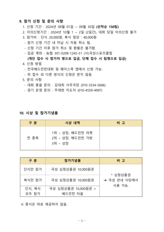 3. 참가비 : 단식 20,000원, 복식 팀당 : 40,000원