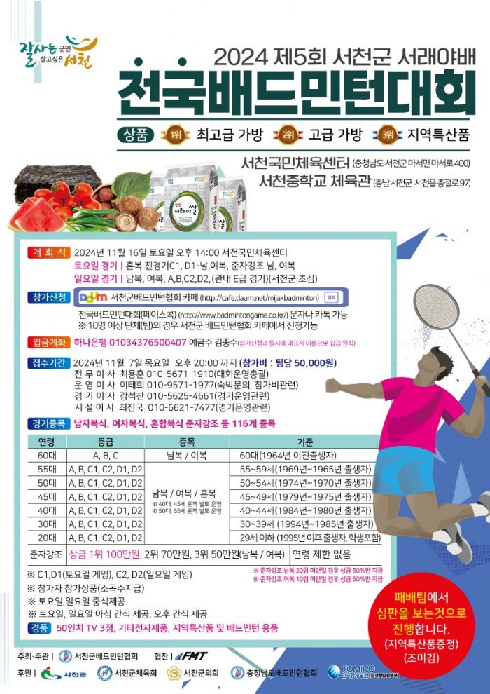 제5회 서천군 서래야배 전국배드민턴대회 감사의 글 안녕하십니까 대회에 참여해주신 전국 동호인 여러분께 진심으로 감사드립니다. |