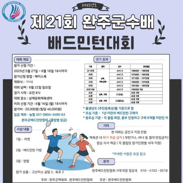 1. 대 회 명 : 제 21회 완주군수배 배드민턴대회